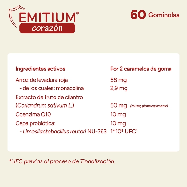 EMITIUM CORAZON 60 CARAMELOS es un complemento alimenticio de última generación presentado en formato de caramelos de goma (gummies) con un intenso sabor a cereza. Desarrollado por Laboratorios NIAM, este producto destaca por su «doble acción» única en el mercado: combina ingredientes botánicos tradicionales con la biotecnología de probióticos tindalizados. A diferencia de las cápsulas convencionales, esta forma galénica es ideal para quienes sufren «fatiga de pastillas» o tienen dificultades de deglución, ofreciendo una biodisponibilidad excelente en un formato ameno y fácil de incorporar al estilo de vida mediterráneo.