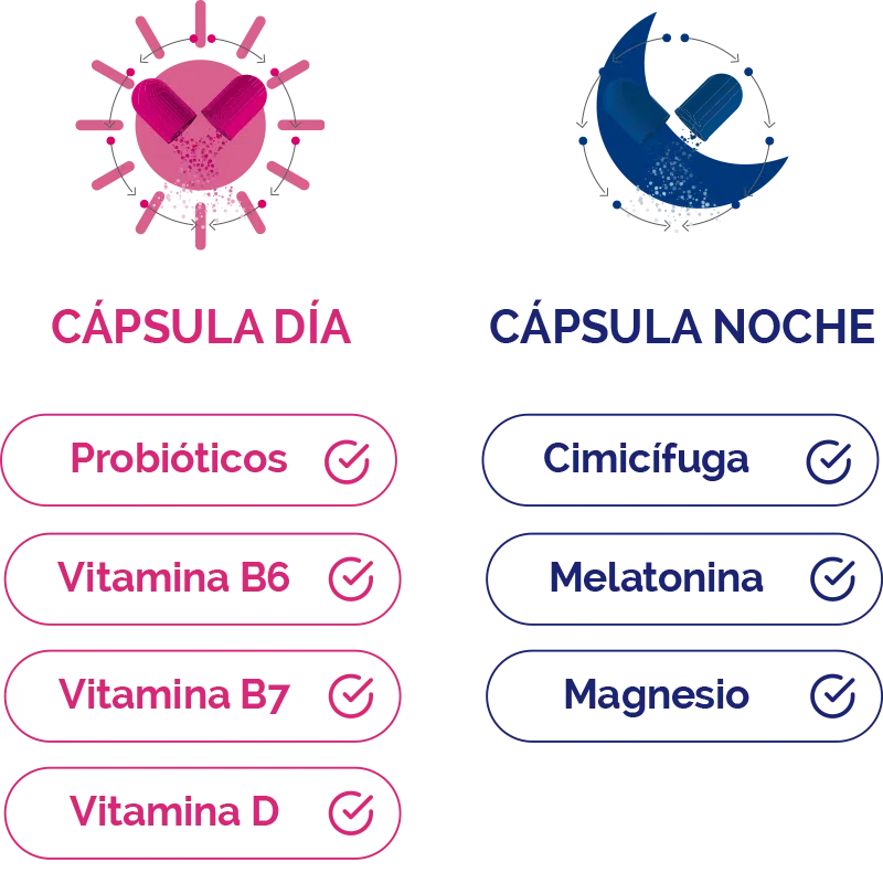 - Cápsula Día (Rosa): Contiene Bifidobacterium lactis y Lactobacillus reuteri (probióticos), Cimicífuga (para sofocos y sudoración), Vitamina D y Biotina.